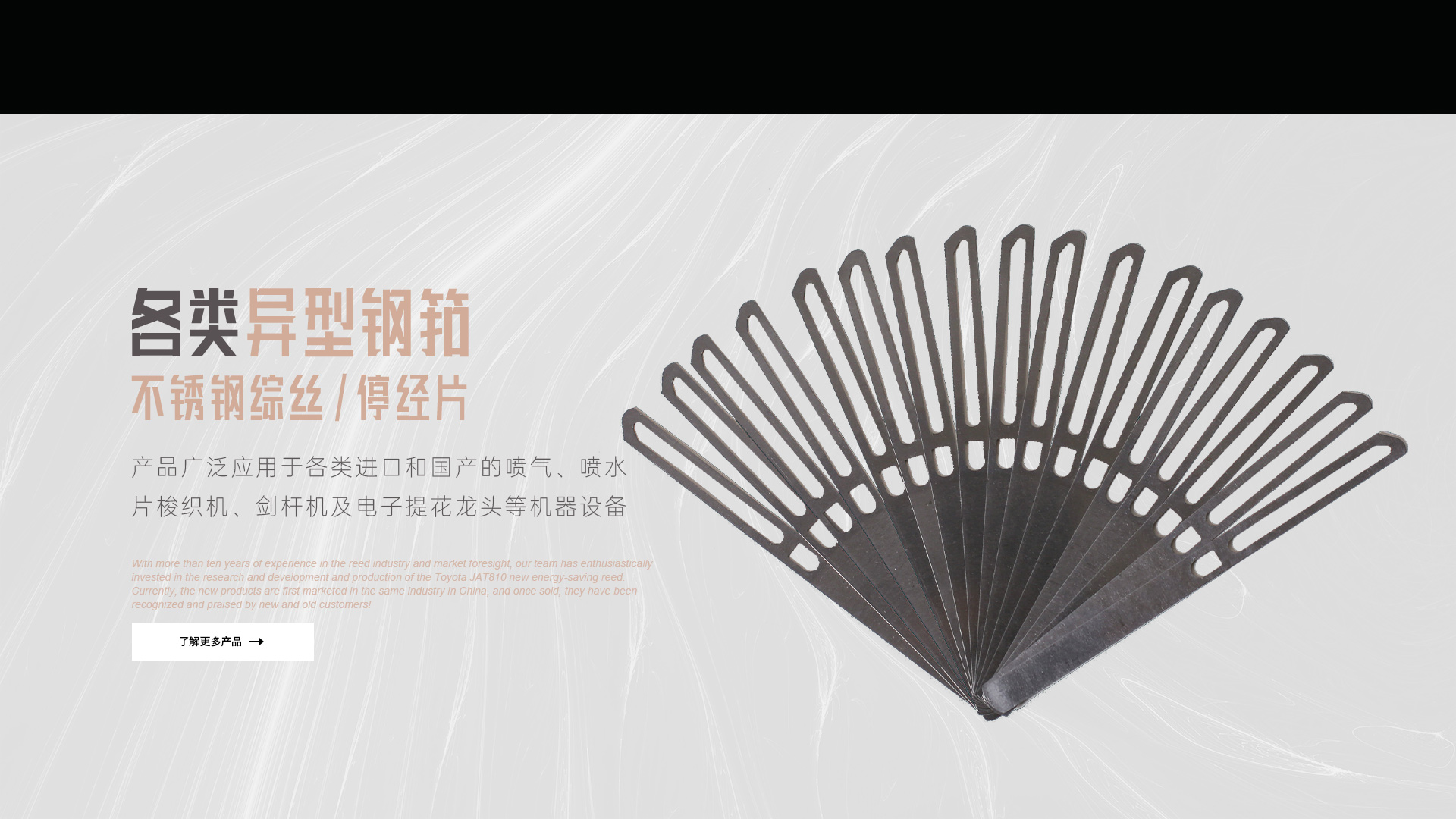憑借十多年鋼筘行業(yè)經(jīng)驗及對市場的前瞻性,我們團隊滿懷熱情的投入到豐田JAT810新型節(jié)能鋼筘的研發(fā)和生產(chǎn)當(dāng)中,目前新產(chǎn)品在國內(nèi)同行業(yè)中先行上市銷售,一經(jīng)銷售就得到了新老客戶的認可和好評!